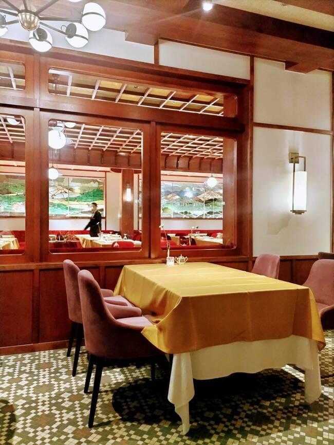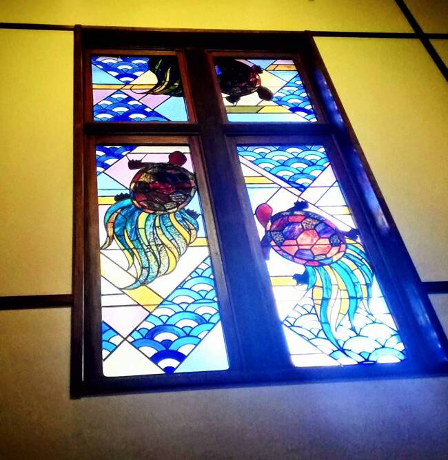 深紅のカーペットの先のフロントでチェックイン。ペンケースには軽井沢彫りの桜が施されている。木軸ペンの懐かしい質感にレセプションのサインの文字までのびやかに。「こちらです」。物腰の柔らかなホテルマンが宿泊棟、アルプス館へと案内してくれる。ちなみにこの「アルプス」は本場スイスではなく日本アルプスをイメージしたもの。階段をあがっていると、踊り場の深紅のカーペットに淡い影模様が。見上げると、木枠の中で二匹の亀が色ガラスの長い尾をきらめかせながら泳いでいる。でも、なぜ亀?「万平ホテルの前身が亀屋という旅館だったからなんですよ」 。ホテルマンが笑顔で教えてくれたのをしおに、さっきから気になっていたことをたずねてみた。「あの、きょう泊まる128号室ってもしかして……?」ホテルマンはふたたび笑顔でうなずく。「はい、ジョン・レノンご一家がひと夏を過ごされていたお部屋です」。「やったね」と心の中でガッツポーズ!