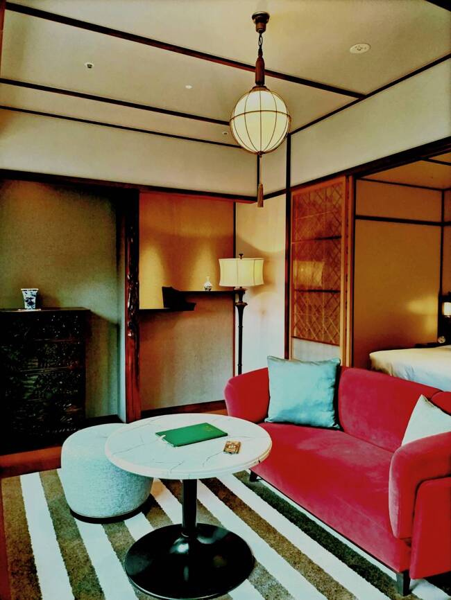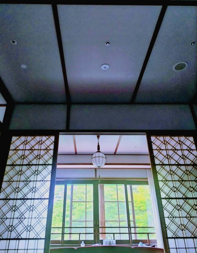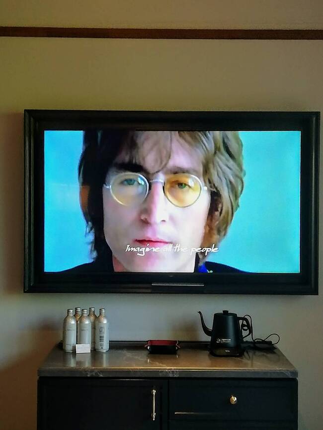 128号室のドアをあけると、ガラス障子で仕切られたベッドルームの先にリビングスペースが配されていた。これがジョン・レノンがひと夏を暮らしていた部屋か。ほどよい広さと木のぬくもりが温かくて懐かしい。「それではよい一日をお過ごしください」。ホテルマンが立ち去ると、テレビをつけYouTubeにログイン。「イマジン」を流して、深紅のソファーに寝転がる。ソファーは座るもの、寝るものにはあらず……わかっちゃいるが、抗えない心地よさ。ほどよい硬さのクッションが身体をまるごと包み込んでくれる。わずかに開いた窓から、清涼でおいしい風がすべりこむ。果実を想わせる天井灯の房飾りがかすかに揺れ、障子にはめこまれた擦りガラスがきらめく。つい今しがたこの部屋の住人になったばかりなのに、たゆたう光の中でまどろみが訪れる。あ~、このまま一歩も動きたくない。