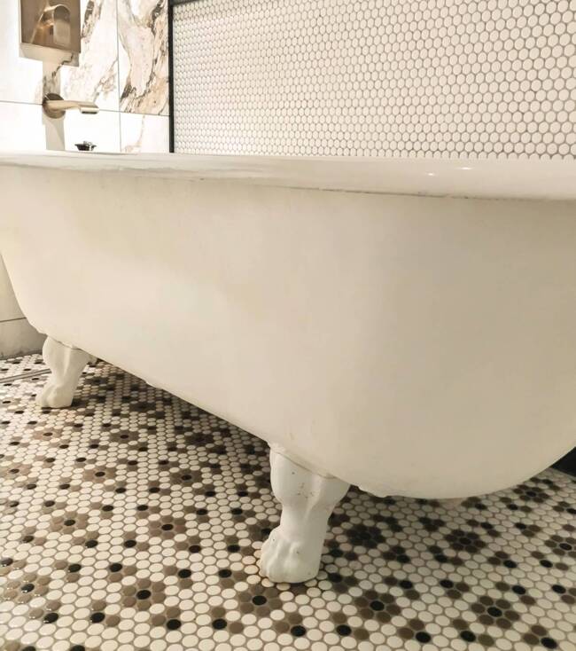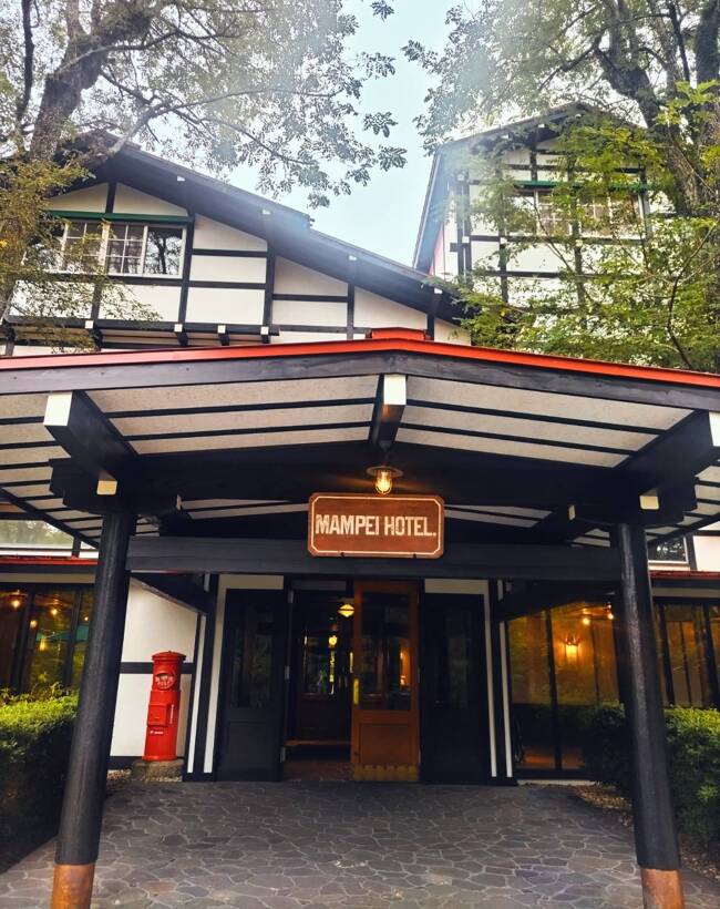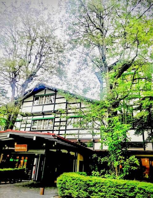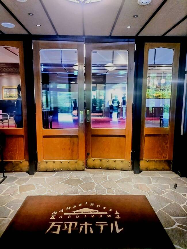 目指すは軽井沢の象徴ともいうべき万平ホテル。タクシーが旧軽井沢の白樺木立を抜けていく。車窓の緑は深さを増し、木漏れ日がゆらめく。常盤色のトンネルの向こうに茜色の三角屋根が見えてきた。ハーフティンバー様式のこの建物はしばしばスイスの山小屋にたとえられるが、実は信州・佐久地方の養蚕農家をモデルにしたそうだ。タクシーがポーチ脇へと静かにすべりこむ。午後3時。三角屋根の影が石畳に斜めにさしこむ時間だ。ベルボーイが軽やかに近づいてきて、荷物を受け取ってくれた。深い庇の下には創業時から変わらぬ「MANPEI HOTEL」の木製プレートが。両開き扉では真鍮のレバーが光っている。脇にはまあるく赤いポスト。写真で見て憧れていた光景が今まさに自分のものとなる。