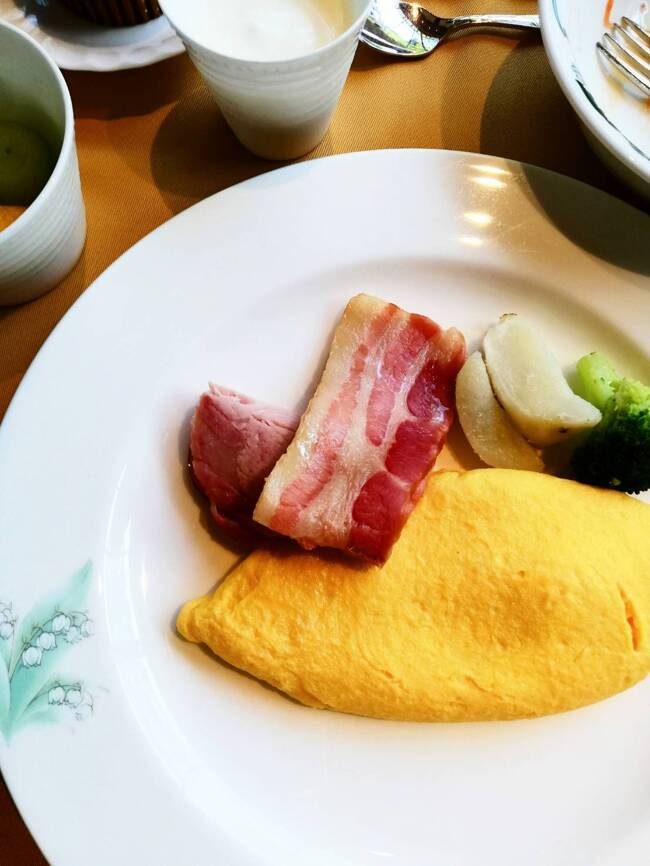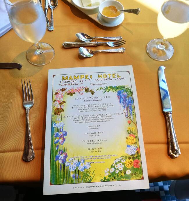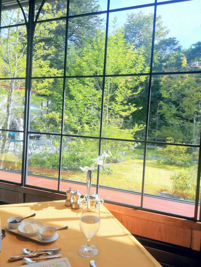 朝がきた。ホテル旅の大きな楽しみのひとつである朝食はメインダイニングで。赤、白、緑の板をランダムに貼り合わせた組天井、壁一面に配されたステンドグラスを見ながら、奥のサンルームへと向かう。こちらは菫色の椅子に山吹色のテーブルクロスという軽やかな雰囲気。テーブルにはよく磨かれたカトラリーとともに高原の花々が繊細なタッチで描かれたメニュー表が。目の前に広がる中庭の緑は朝日に照らされ瑞々しく光っている。BGMは鳥のさえずり。そこに健やかな風が……。いや、窓はしまっているから無風なのだけど、たしかに風を感じるサンルーム。ほどなくして、アメリカンブレイクファーストが運ばれてくる。スズランの絵がついた皿のうえでは見目麗しいオムレツが。ナイフを入れるとこの黄金色の衣がいかに薄く繊細なのかがわかる。温野菜、ジューシーで肉厚なハム、信州野菜のサラダ、季節のジュース、フルーツ&ヨーグルト、三種のブレッドとオリジナルジャムにコーヒーがついていて、このうえなく満たされる。