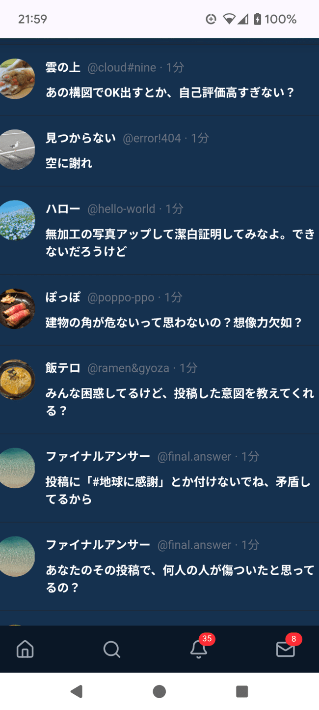 でも実際やってみたらちょっと凹みました。空と飛行機雲とちょっと建物が写った写真をアップしたのですが、とたんにそのサイト内で通知音が鳴り響き、見たら炎上状態に。「全て閉じられた世界での幻影」「建築警察だけど、あの壁の素材について一言いいかな?」「あの構図でOK出すとか、自己評価高すぎない?」「みんな困惑してるけど、投稿した意図を教えてくれる?」「建物の角が危ないって思わないの? 想像力欠如?」「もっとマシなもん投稿できないわけ?」「空に謝れ」など。中には珍しく「見た瞬間に『好き』って声出ました」とか好意的なコメントがありますが、95%批判なので全然頭に入ってきません。そしてついに「Y」SNSの中で「#だから何」「#センス皆無」といったタグがついてトレンドまでになってしまいました。
