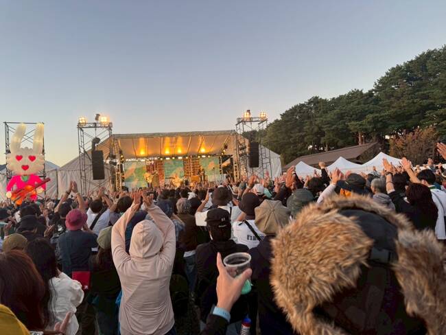フェス参加者の人々は、音楽が始まると皆一斉にステージへ。音楽が終われば休み時間の合間に各出店を見学し始めます。
