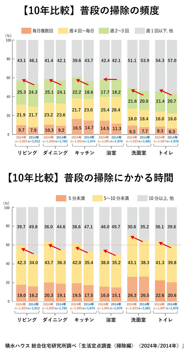 普段の掃除の頻度については、10年前と比べて大きな変化はありませんが、リビング・ダイニング・キッチンでは「週2~3回掃除する」という人が少し増えています。一方で、掃除にかける時間には変化が見られます。10分以上かける人が減り、5分から10分未満で済ませる人が増えているのです。