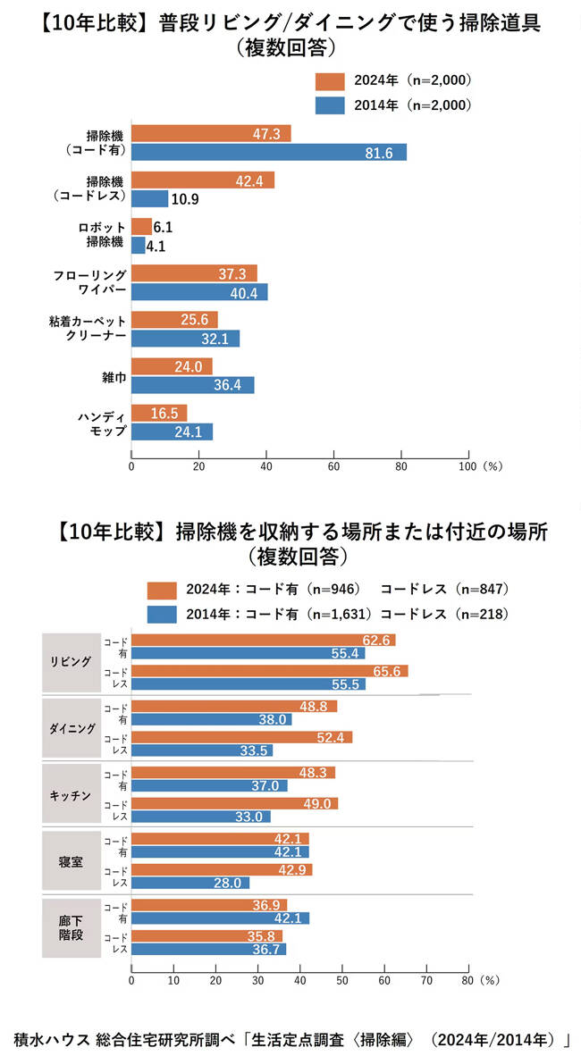まず、コード付き掃除機の使用が減り、コードレス掃除機を使う人が増えていることがわかりました。取り回しのしやすさや、すぐに使える手軽さが支持されているのかもしれません。
