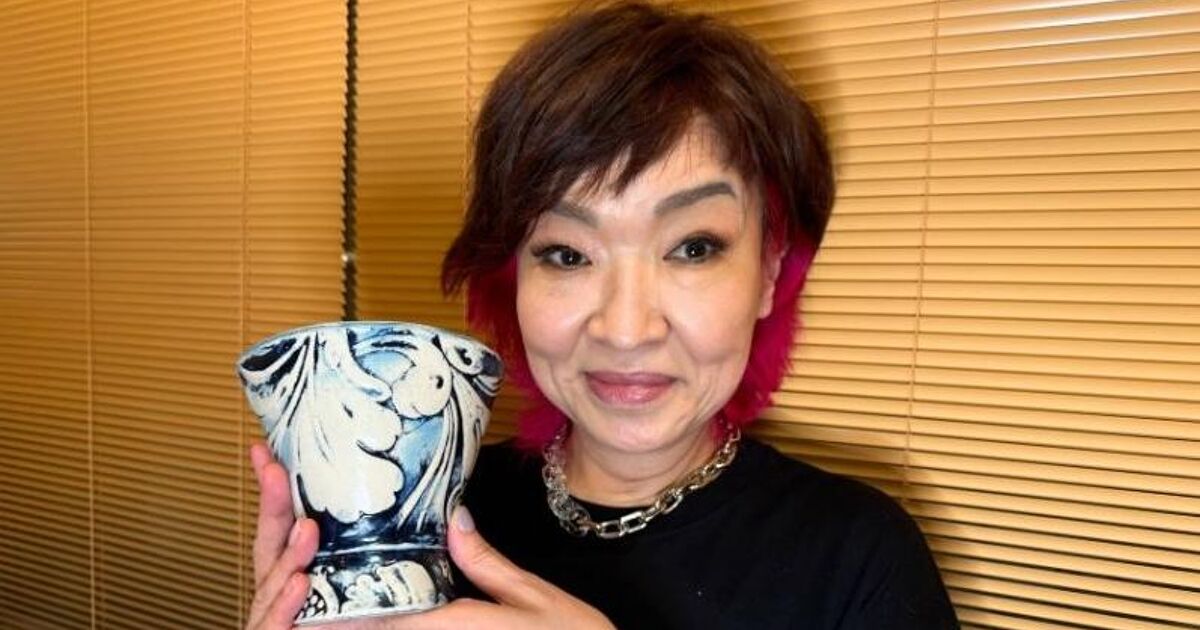 【シミチコNEWS】大阪万博のイタリア館で現地の新聞取材を受けました。ついに世界のミチコ・シミズデビューです。こちらが靖子の形見。