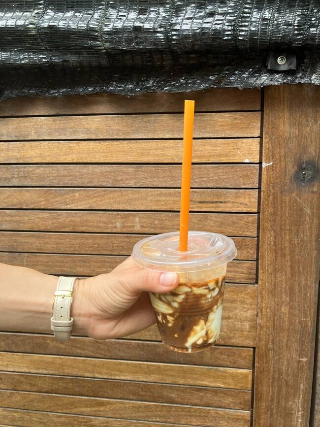 どうやって作るのか、レジ越しにじーっと見ていると、お姉さんが給食についてくるような、よくあるカップヨーグルトのアルミの蓋を剥がし、中身をまるごとドボンとガラスのマグに沈めた。そして上からアイスコーヒーを注ぐ。