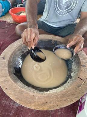 庭先に置かれた大きな木鉢には、濁った茶色の液体。「カヴァ」といって、フィジーやトンガ、バヌアツなど南太平洋の島々で古くから飲まれている伝統的な飲み物だ。原料はヤンゴーナという植物の根で、それを乾燥させ、砕いて水で溶いたものを木鉢に入れて作る。悪く言うつもりはないのだが、見た目は完全に泥水だ。