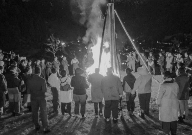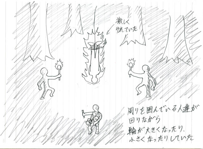 - 10数人の村人? 街灯なし、火を囲んでいる なんらかのギシキ?