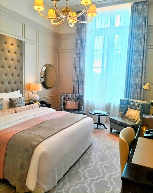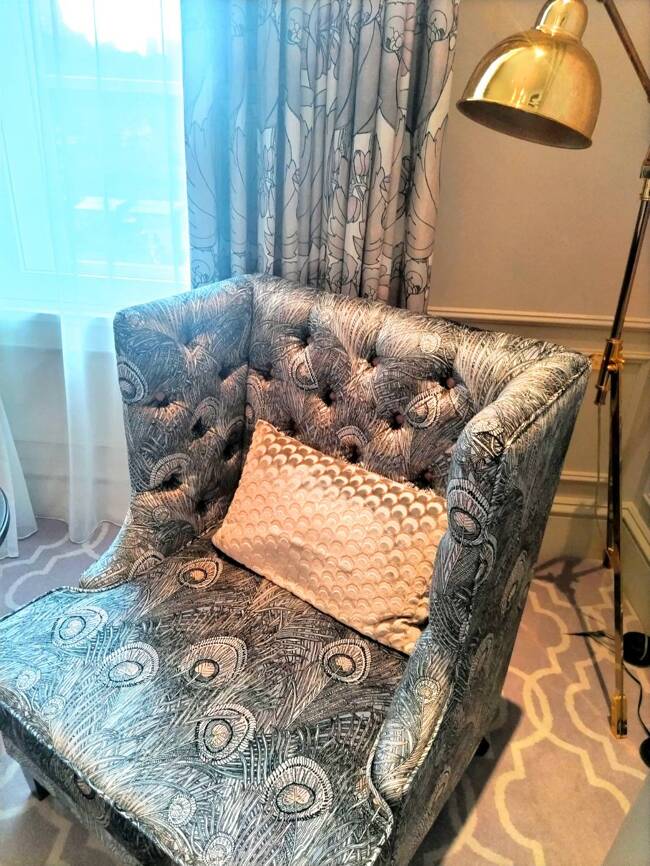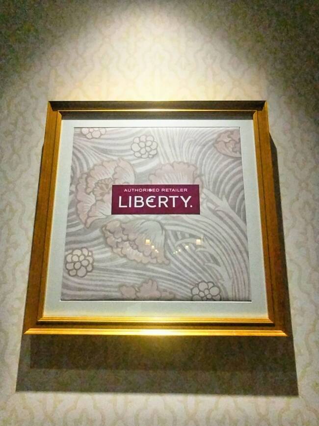 先日は「LIBERTY」とコラボレーションした客室にも泊まった。自分の部屋をこの英国老舗ブランドの意匠で統一するなんて夢のまた夢。だけど、ここでは、その夢が現実となる。滞在したのはモーブピンクとシルバーグレーを基調とした「HERA」。浮世絵から着想を得た壁紙とカーテン、繊細な羽根模様のソファやクッションは、この客室のためだけにつくられたオリジナル。絨毯も室内の色味にあわせて特別に織りあげられ、ホワイトグレーのモールディングによく馴染む。江戸のモダニズムと英国の伝統の掛けあわせは、東京でもロンドンでもない、至福の空間を生み出した。縦長の大きな窓から差し込む陽ざしとファブリックも麗しく調和する。光の角度で異なる色味にきらめく貝殻模様のクッションの手触りはヴェルベットのごとく。ソファに身をあずけ、クッションを撫でているだけで、心がほろほろとろけていく。