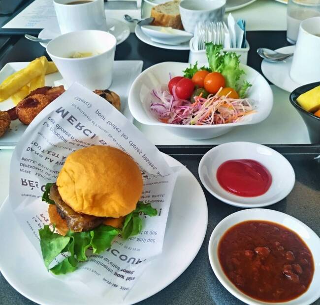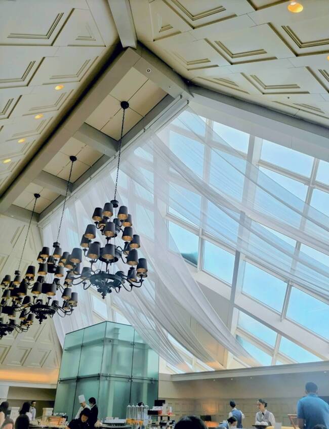 長い廊下を曲がって、また曲がって、しばらく行くと、物語に出てきそうな優美な階段につきあたる。その先にあるのがゲストラウンジ「アトリウム」だ。丸の内駅舎を正面から見ると、中央に台形の屋根がある。その屋根裏にあたるこの空間、高い天窓から朝の澄んだ光が降り注ぐ。そう。憧れの朝食ブッフェの始まりだ。中央に食事スペース、両サイドに和洋や季節限定の一皿、シャルキュトリ、スープ、サラダ、パン、デザートと100種類以上の朝食アイテムがずらりと並ぶ。特製スムージーを飲み、シェフが目の前で焼いてくれたふわふわの黄金色のオムレツを口に運ぶときの幸福感といったら! さらには焼き立てのパンの香ばしさ、温かいスープや餡バターの香りの優しさ……。自然光が照らし出す朝食は、きょうもつつがなく一日を始められるという安心感を与えてくれる。
