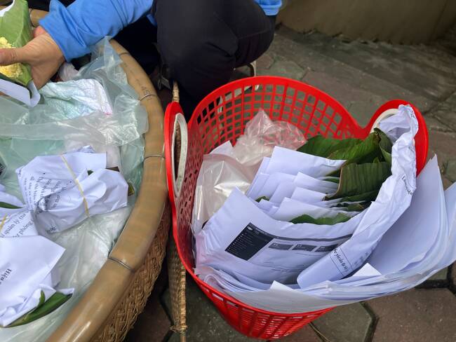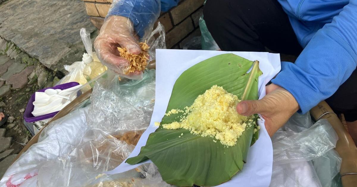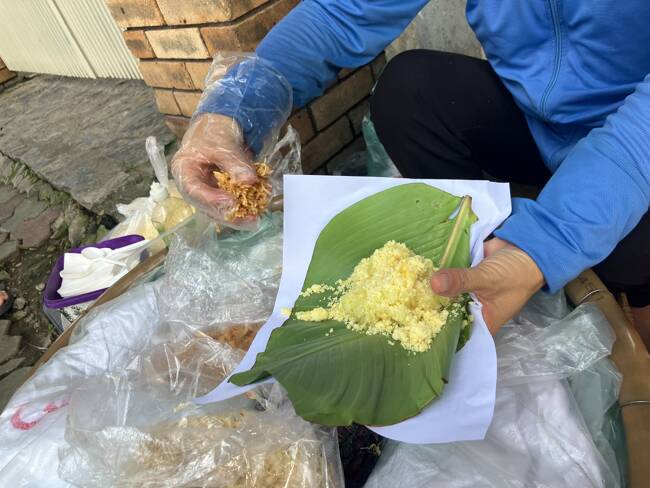 ザルの中は二層になっていてプレーン味とウコンで色付けした黄色のおこわがある。客は指をさし、好みを伝える。仕切りは大きなバナナの葉である。