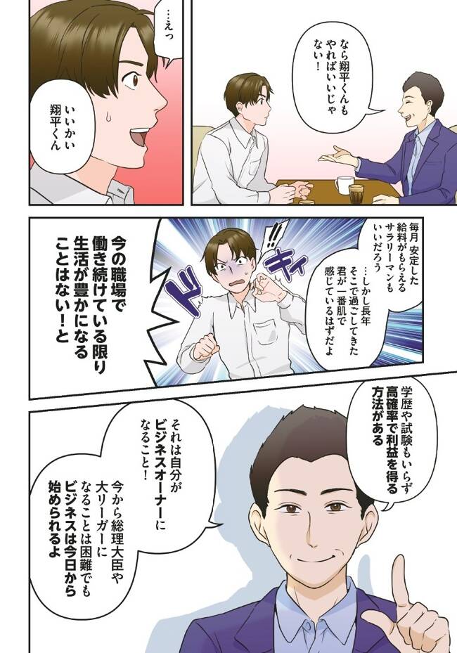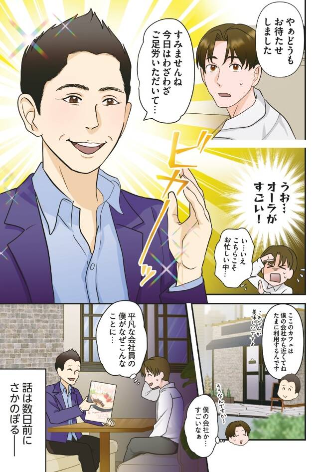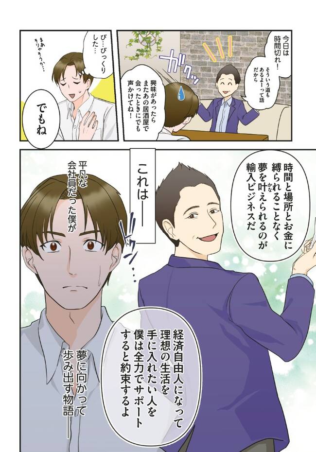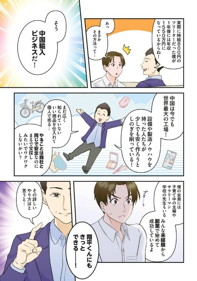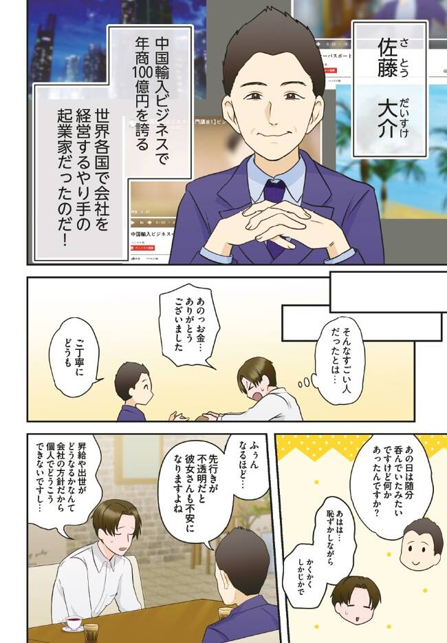 本書では、図版を使ったわかりやすい解説パートに加え、日々の仕事や生活に行き詰まりを感じていた主人公・桐生翔平が中国輸入ビジネスと出会い、人生を変えていく過程を描いたマンガも収録しています。今回はその中から、主人公が中国輸入ビジネスと巡り合う“始まりの場面”をご紹介します。