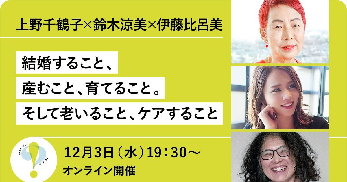 12月3日(水)19時半~21時半、上野千鶴子さん、鈴木涼美さん、伊藤比呂美さんによるオンライントーク「結婚すること、産むこと、育てること。そして老いること、ケアすること」を開催します。