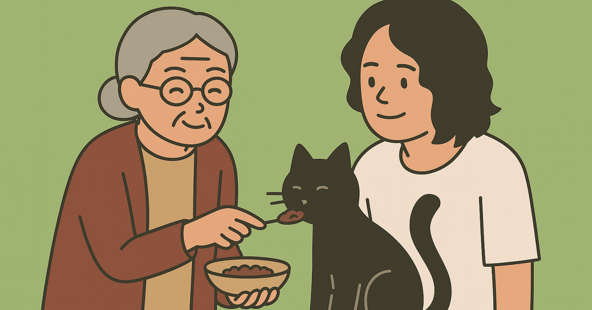 「佐藤さん」と一緒に地域猫に餌をあげるという