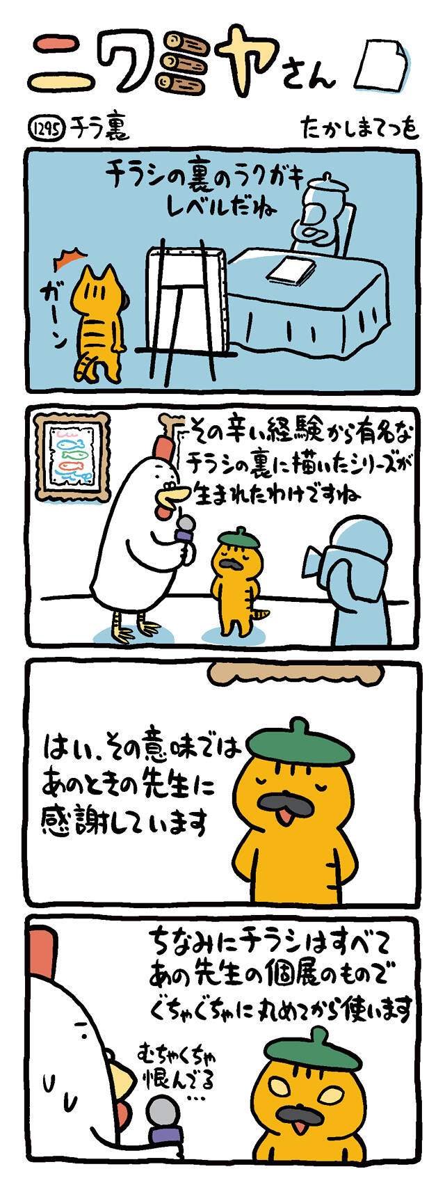 子供の頃は新聞の折り込みチラシの裏に絵を描くのが好きでした。真っ白なのもいいけど、黄色とか青色とか色の付いたチラシだと特別感があってテンション上がりました。ツルツルした高級そうな紙よりもザラザラした安価そうな紙の方が描きやすくてうれしかったですね。おそらく当時もちゃんとしたスケッチブック的なものは持っていたと思うんですが、楽しく描いてた思い出としてまず頭に浮かぶのがチラシの裏なんですよね。いまで言うとお洒落なラウンジで飲むのもいいけど、横丁の立ち飲みの方が気楽に楽しめるみたいな感覚でしょうか。カフェで一服するときとかにレシートの裏に絵を描きたくなるのは、チラシの裏に描くあの気楽で楽しい感覚を忘れられないからかもしれません <´ `