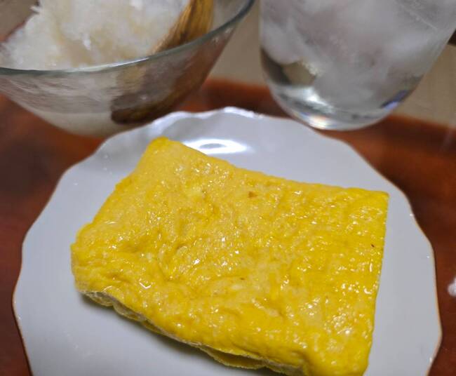 【本日の乾杯】ライフのだし巻き玉子。最高のおつまみ。卵が隠れるくらいたっぷりの大根おろしを添えて。いつもの日本酒ロックで。お疲れ様でした。