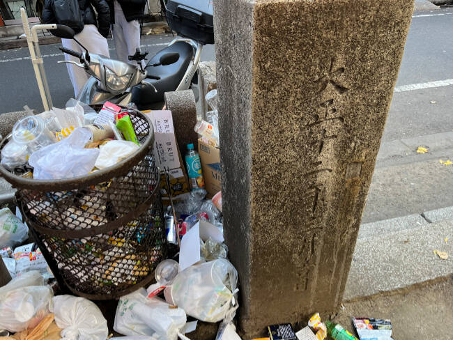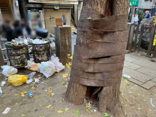 また、ご神木らしき場所のすぐ後ろにはゴミ箱が置かれ、周囲にゴミが散乱していたが、おそらく通りを歩く人が投げ入れたのだろう。