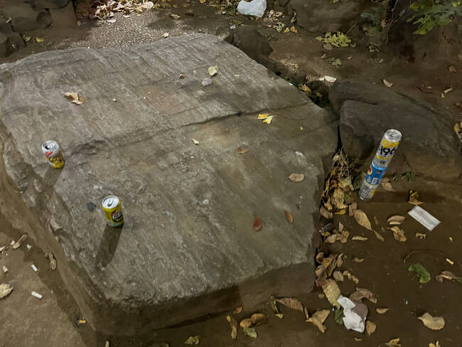 入口はふさがれておらず、周囲は低いパイプ柵でぐるりと囲われているだけ。腰かけるのにちょうどいい階段や石があり、ゴミ箱も完備され、手水舎まである。これだけの条件が揃っていれば、「ワル」のたまり場になっていてもなんら不思議ではない。