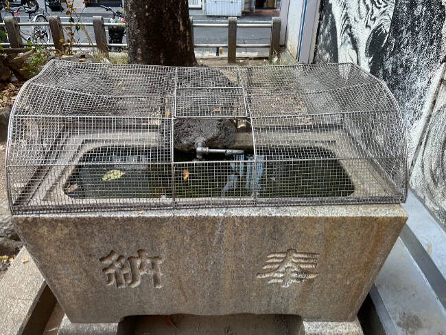 手水舎は金網で覆われており、蛇口をひねったら水が出ると思われるが、なんだか手を出しにくい。
