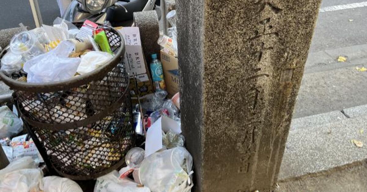 また、ご神木らしき場所のすぐ後ろにはゴミ箱が置かれ、周囲にゴミが散乱していたが、おそらく通りを歩く人が投げ入れたのだろう。