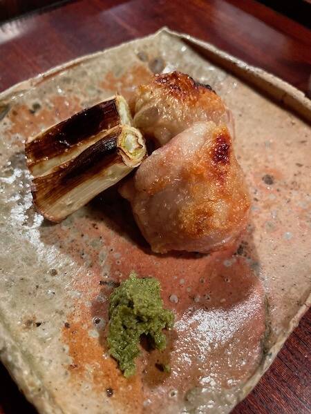 京都の赤地鶏とねぎを柚子胡椒とともに。1人だとこれくらい少しずつが最高です。
