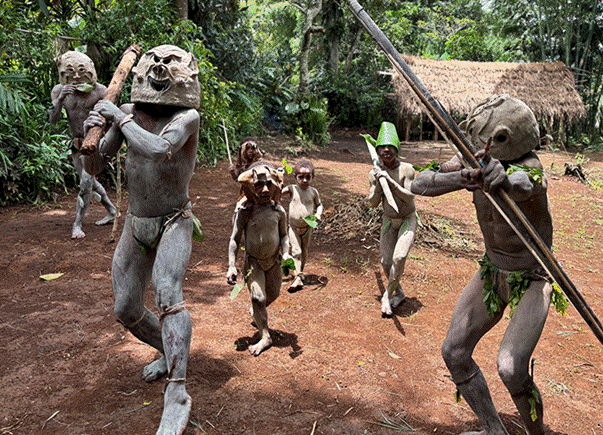息をひそめながら敵が通り過ぎるのを待とうとしたが、敵が泥沼のそばにやって来た瞬間、「今なら意表を突くことができる!」と泥の中に隠れていた村人たちは一斉に姿を現した。全身が灰色の泥に覆われ、その顔はまるで泥が固まってできた仮面のよう。目の部分だけが黒くくぼみ、口元は無表情に固まっている。その異様な姿を見た敵は、「精霊だ」「不吉な存在だ」「泥のお化けだ!」と恐れて逃げ出し、村人たちは戦いに勝利した。