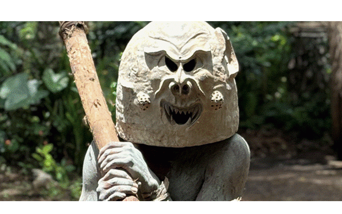 息をひそめながら敵が通り過ぎるのを待とうとしたが、敵が泥沼のそばにやって来た瞬間、「今なら意表を突くことができる!」と泥の中に隠れていた村人たちは一斉に姿を現した。全身が灰色の泥に覆われ、その顔はまるで泥が固まってできた仮面のよう。目の部分だけが黒くくぼみ、口元は無表情に固まっている。その異様な姿を見た敵は、「精霊だ」「不吉な存在だ」「泥のお化けだ!」と恐れて逃げ出し、村人たちは戦いに勝利した。