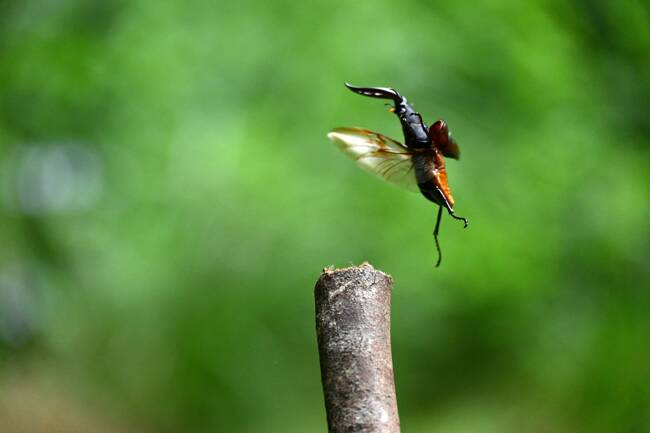 そんなことをいろいろ思案して捕まえるのを躊躇していました。そうこうしているうちに、そのクワガタムシはパッと羽を広げ、急に飛び立ってしまったのです。それは、一瞬の出来事でした。一度、大空に飛び立ったクワガタムシを捕まえるのは容易ではありません。