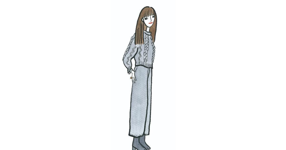 ジーンズは、ほぼ毎日穿いているという彼女の定番アイテム。ざっくり感が可愛いシェットランドウールのセーターは、どんな着こなしにもはまるシンプルなデザインですが、カジュアルになりすぎないよう、インナーには上質なシルク素材のフリル襟が付いたブラウス、足元はハイブランドの靴を合わせておめかし。TPO によってヒールのある靴や、夏はBirkenstock のサンダルにすることも。マニッシュとガーリーの甘辛ミックスが絶妙なコーデです。