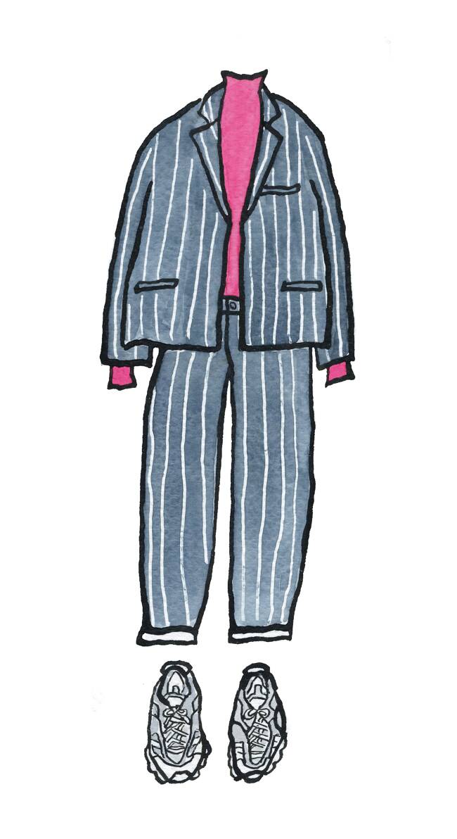コンサルタントを務めるクライアントとのアポには自身のブランドが得意とするメンズライクなピンストライプのテーラードジャケットとパンツのセットアップでのぞみます。堅くなりすぎないよう、インナーにはネオンピンクのボディトップ、足元はBALENCIAGAやNew Balance のハイテク系スニーカー、そしてパンツはラフにロールアップするのがオレリー流。あくまでもハズしのテクであることがわかるよう、特にスニーカーのブランド選びは大切。