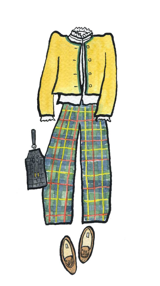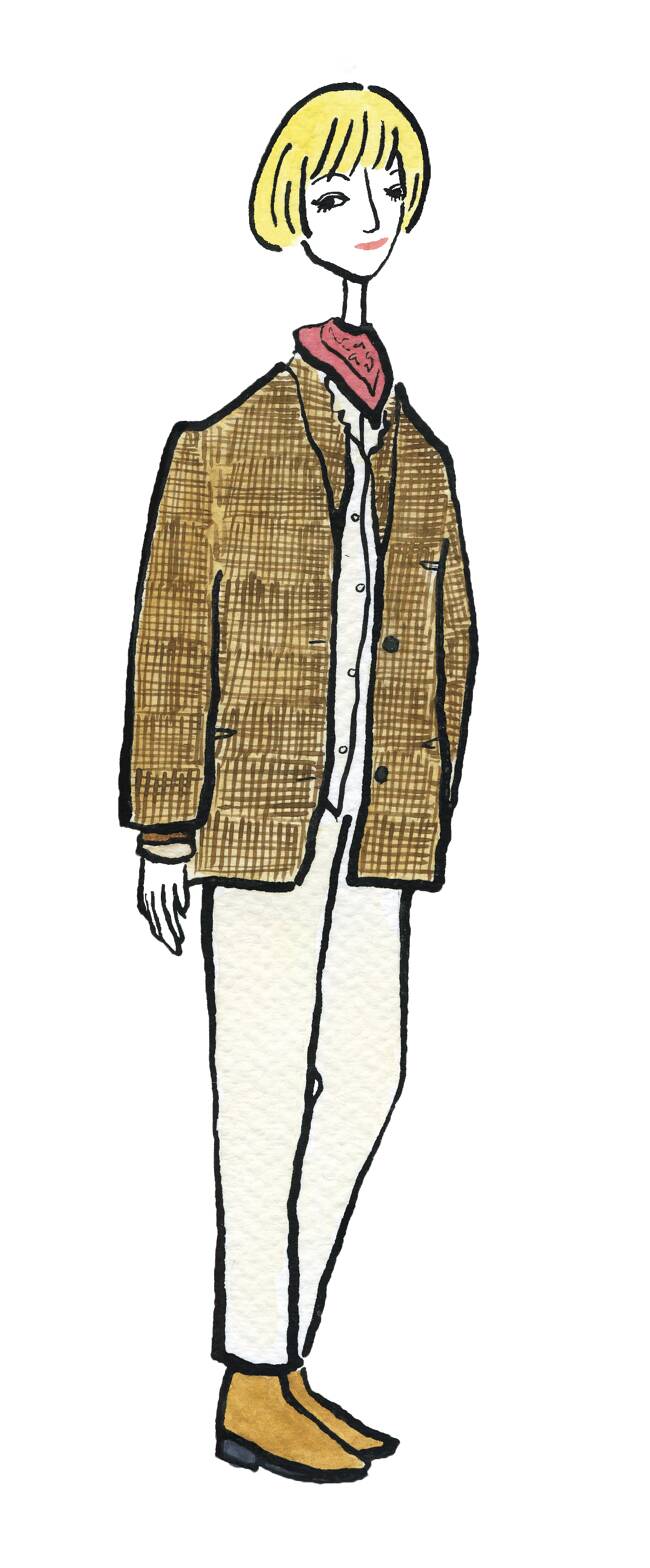 トラッドなスタイルも、アンヌ= モードの手にかかればこんな風に遊び心のあるルックに。定番のタータンチェックのウールパンツに、あえてノーカラーのパイピングジャケットを合わせ、イエローにグリーンの縁取りや縦ステッチのキルティング、パフスリーブなど少しクセのあるアイテムを持ってくるところがおしゃれ上級者。襟元や袖口からシルクブラウスのフリルをのぞかせて甘さを添え、Milkmanと名付けられたクロコの型押しバッグと母から譲り受けたヴィンテージのタッセルローファーで引き締める、秋のパリに映える彼女らしいトラッドスタイルです。