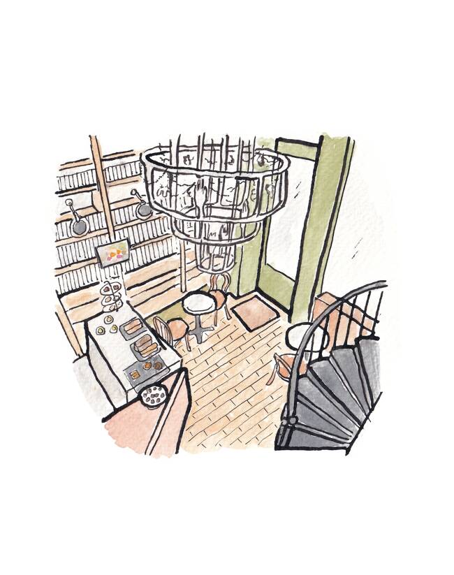 パリ散歩の途中でおいしいカフェラテを飲むのが週末の楽しみです。お気に入りのお店はたくさんあるけれど、ここがコーヒーショップのマイ・ベスト。1872 年に創業した歴史的な書店を改装した小さなスペースで、壁一面の本棚や、美しい螺旋階段を配したインテリアも好み。自宅のリビングのインテリアは、ここからインスピレーションをもらっています。このお店があるサンジェルマン・デプレ地区そのものも大好きなエリアです。