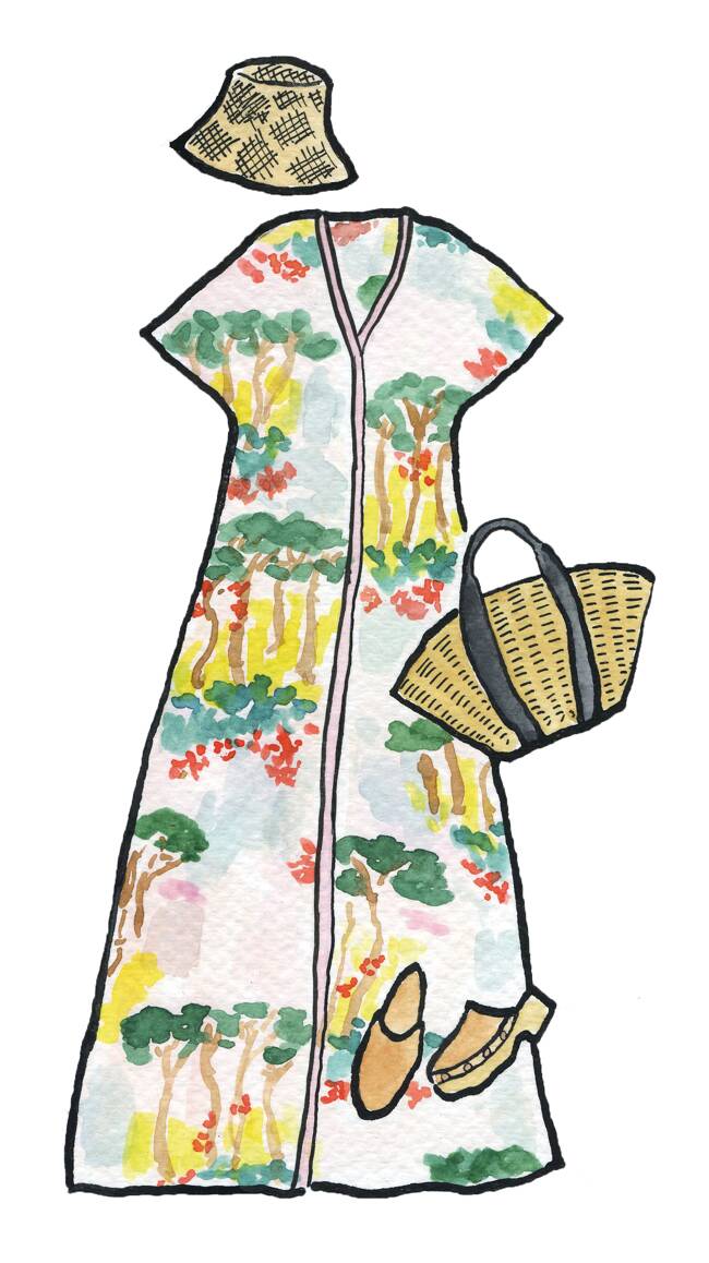 夫の家族が暮らすプロヴァンスは夏のバカンスに必ず訪れる場所のひとつで、のどかな村々をのんびり散歩するのがお気に入り。南仏の照りつけるような太陽の下では、ふんわりゆったりと流れるようなシルエットの涼しげなカフタンのマキシワンピースをチョイスします。陽の光を受けて鮮やかに映えるカラフルなワンピには、ナチュラルな麦わら帽子とかごバッグがぴったり。大きめに開いたデコルテに、ゴールドのシンプルなチェーンやパールのチョーカーなど素材も長さも異なるネックレスを重ね付けすれば、エレガントなリゾートスタイルの完成です。