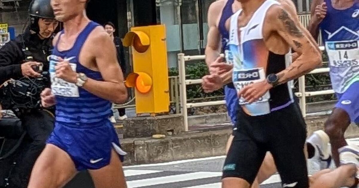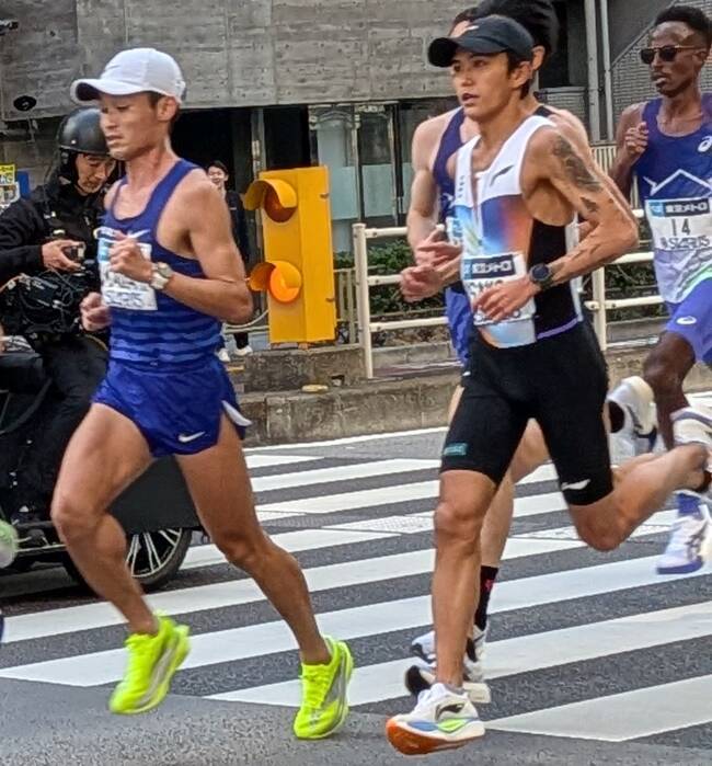 そして途中までトップ独走していたのが橋本龍一選手。半分くらいまで黒人のトップランナー集団よりも速かったです。私が見たときは小柄なメガネ男子が笑顔で走っていて、すごく気持ちよさそうでした。会社名の宣伝にもなってそうです。一人で独走することをマラソン界隈では一人旅と呼ぶみたいですね。この方は後半追い抜かれて39位でしたが2時間11分21秒という速さでした。