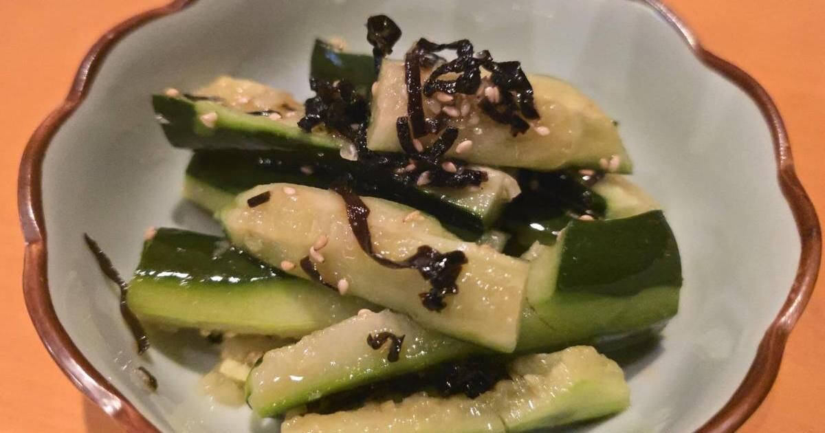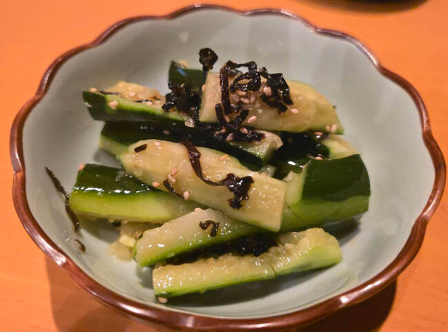 【本日の乾杯】キュウリの塩昆布和え。しかもこのキュウリの砕き方、美味しいに決まっている。こういうシンプルなヤツは信頼できるのだ。