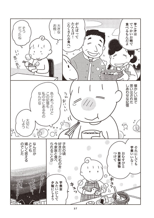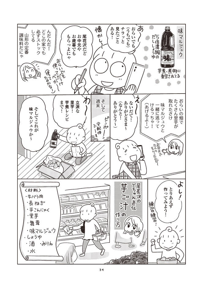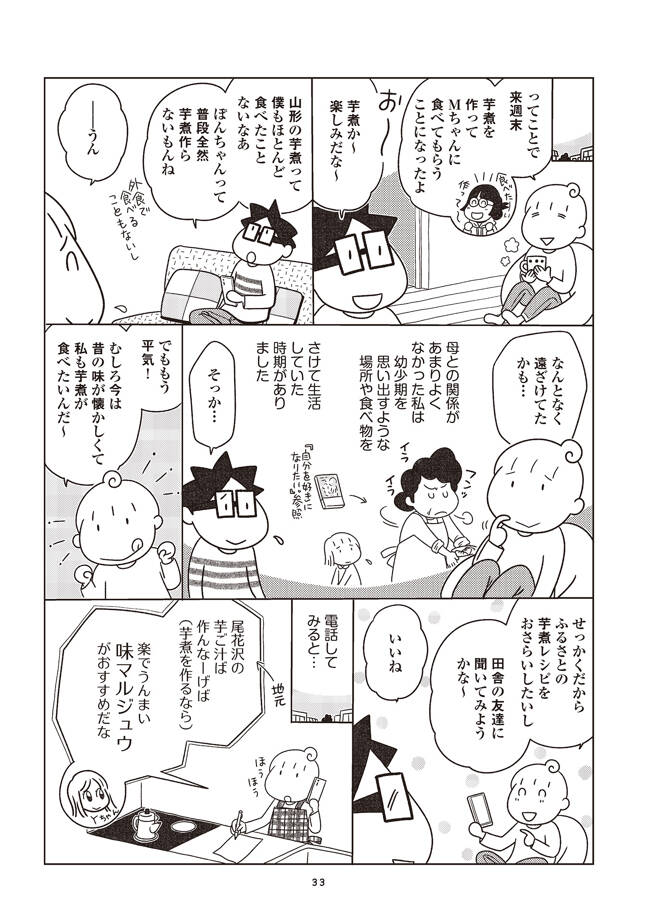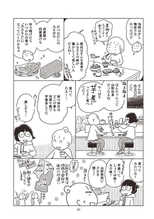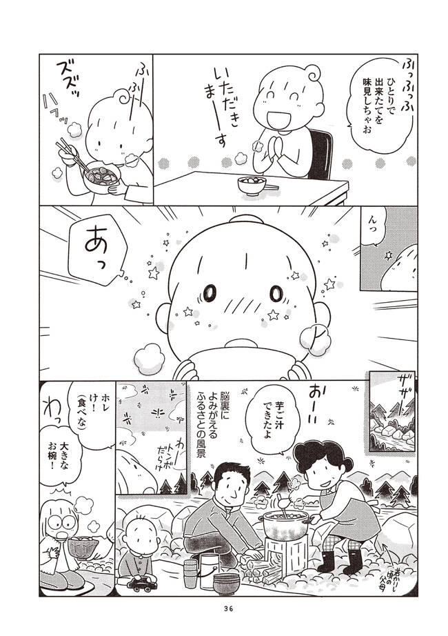 ふるさとの懐かしい味から、社会人になりたての頃の思い入れのあるメニューまで、記憶に残る味わいを再現してみた食エッセイ漫画『思い出ごはん』(わたなべぽんさん著)が発売になりました!少しずつですが、試し読みです。今回はカバーも飾っている、著者の地元名物・芋煮のお話。