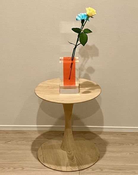 完全受注販売というハードルの高さと価格の高さにたじろいだが、その後数ヶ月、蛍光ピンクと透明のアクリルが生み出す非現実感が解けない謎のように頭に残った。迷った挙句、京都の巡回展で購入することに。といってもその時はちょうど飛騨高山へフィールドワークに行っていたので、知人に頼んで購入してもらったことを覚えている。知人曰く、美術館の物販で購入する人が滅多にいないとのことだったが……。やはり私と同じように皆たじろいだのだろうか。