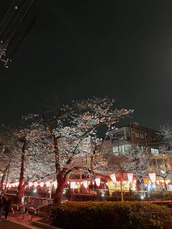 こちらは久しぶりに中目黒の目黒川沿いで見た夜桜。まだあまり咲いていなかったので、人もまばらでした。