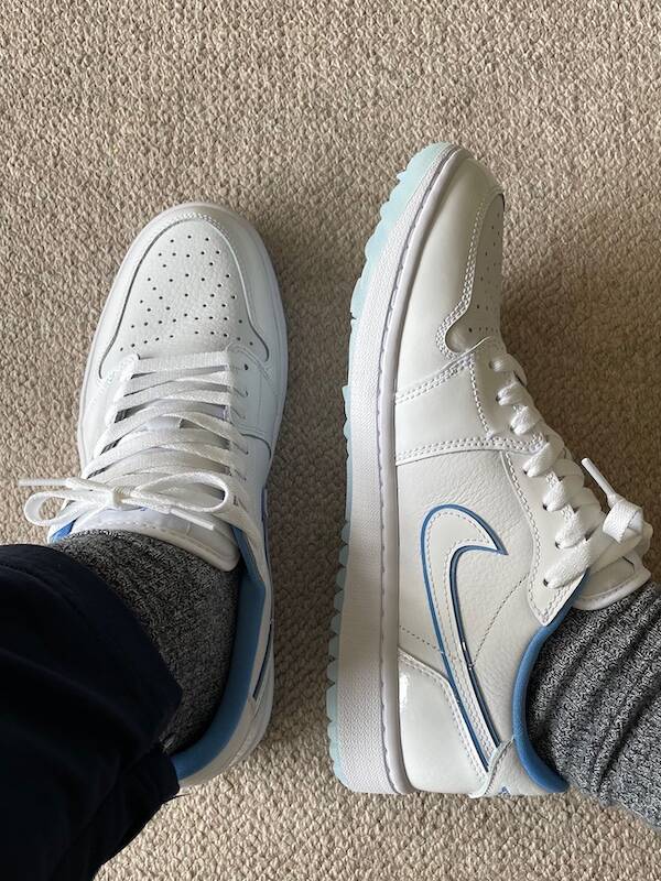 縁取りはライトブルー、ソールはスケルトンで春にピッタリ。ちなみにゴルフシューズですが、普段履きにもしてます。