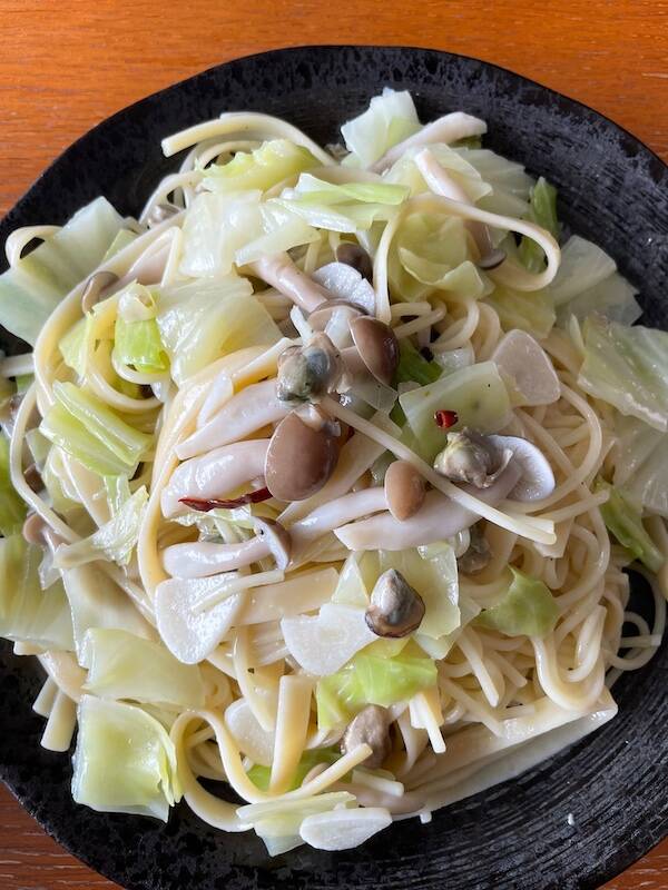 ラストはパスタ。細いパスタと平たいパスタが少しずつ残ったのでミックス(笑)。シジミとしめじと春キャベツのペペロンチーノを作ったんですが、めっちゃ美味しく出来ました。