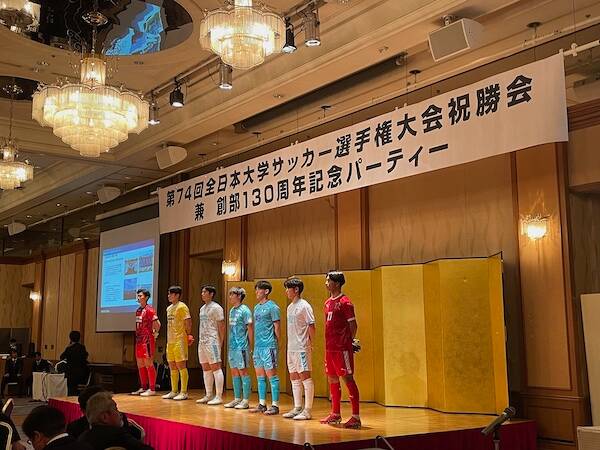 その翌日はつくば駅近くで、筑波大学蹴球部130周年&45年ぶりのインカレと関東リーグ二冠の記念パーティーでした。今年からユニフォームが変わります。