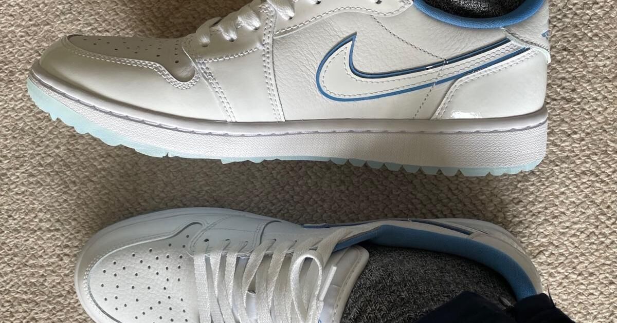 縁取りはライトブルー、ソールはスケルトンで春にピッタリ。ちなみにゴルフシューズですが、普段履きにもしてます。