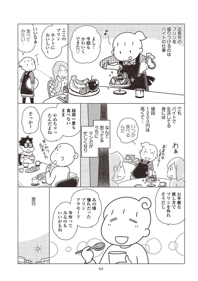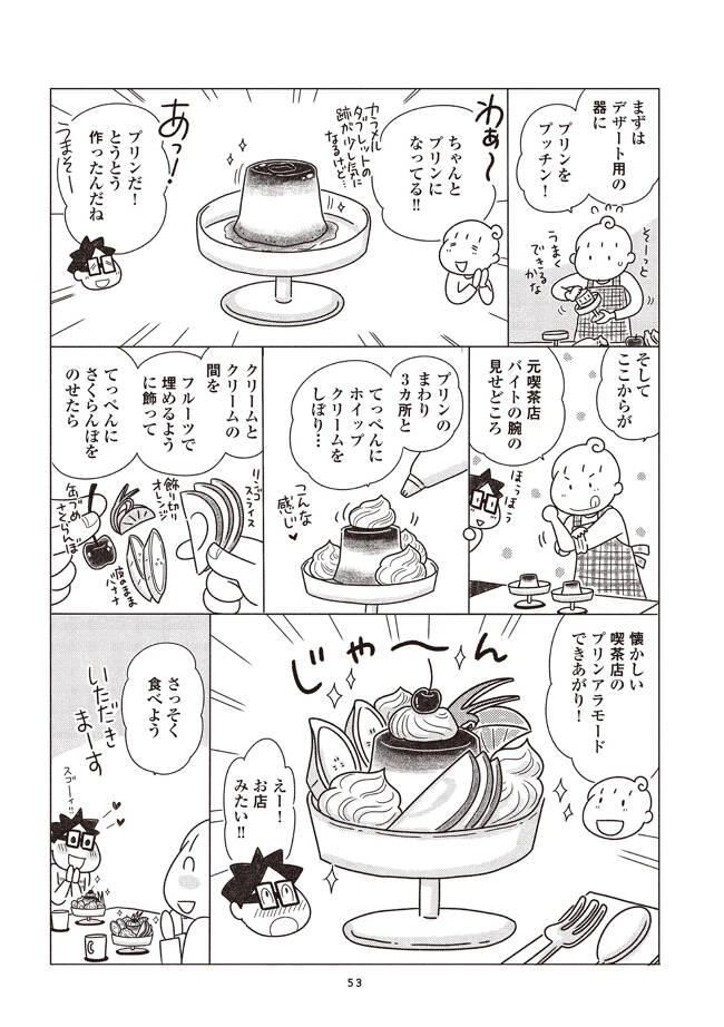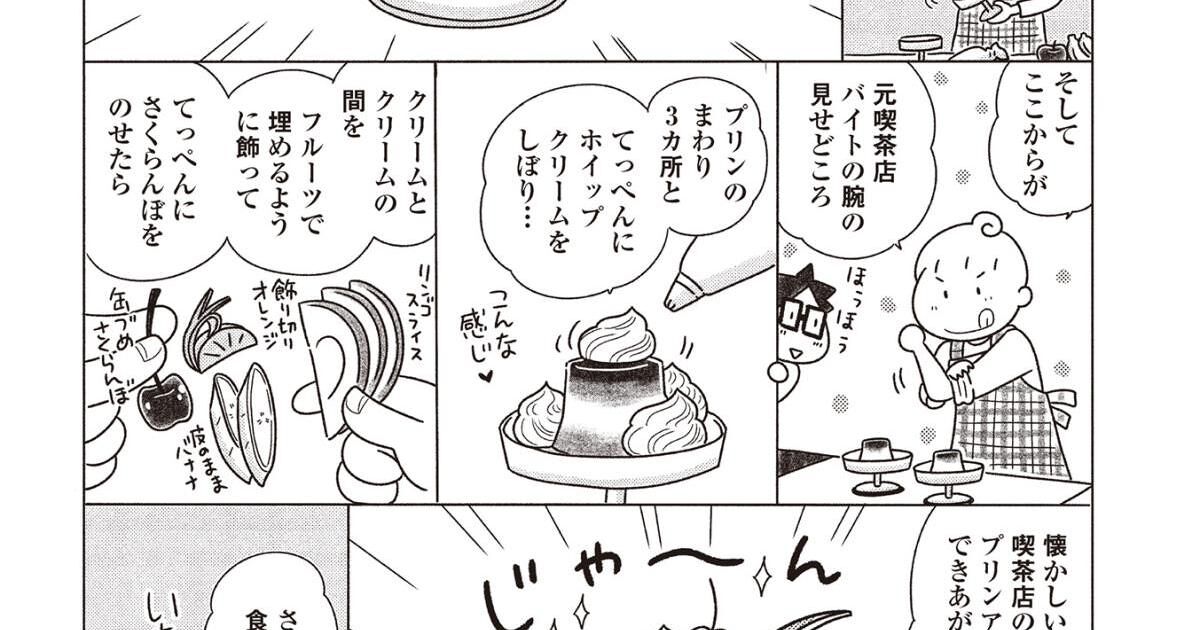ふるさとの懐かしい味から、社会人になりたての頃の思い入れのあるメニューまで、記憶に残る味わいを再現してみた食エッセイ漫画『思い出ごはん』(わたなべぽんさん著)が発売になりました!少しずつですが、試し読みです。今回はアルバイト時代の憧れ、プリンアラモードについて。