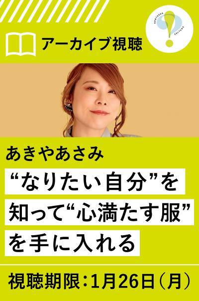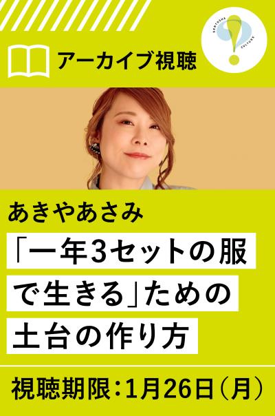 『一年3セットの服で生きる』『「一セット」の服で自分を好きになる』の著者である、制服化スタイリストのあきやあさみさんの新刊『自問自答ファッション 制服化スタイリストが教える自分らしく生きるヒント 』(朝日新聞出版)が11月20日に発売になります。幻冬舎カルチャーでは、発売にあわせ、あきやさんのこれまでの講座7回のアーカイブを再販売いたします。